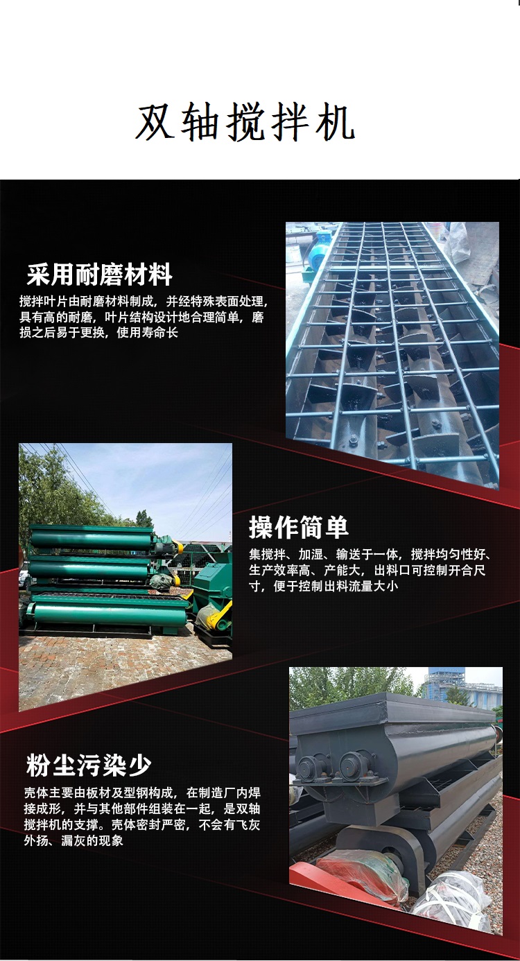 雙軸攪拌機(jī)利用兩根呈對稱狀的螺旋軸的同步旋轉(zhuǎn),在輸送干灰等粉狀物料的同時加水?dāng)嚢,均勻加濕干灰粉狀物料,達(dá)到使加濕物料不冒干灰又不會滲出水滴的目的,從而便于加濕灰裝車運(yùn)輸或轉(zhuǎn)入其它輸送設(shè)備。